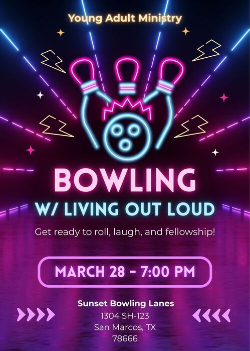 Come out and enjoy a night of bowling and fellowship with the Living Out Loud Young Adult Ministry! We believe that community matters, and this will be a great opportunity to connect, laugh, and grow together. Whether you're competitive or just coming for the fellowship, everyone is welcome. Invite a friend and join us for a great night together!